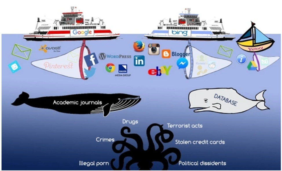 По разным оценкам, объем Surface Web составляет от 1 (мнение CNN) до 15–20 процентов (мнение нетсталкерского комьюнити[2]) всего объема информации, которая есть в сети. Формального антонима этому понятию не существует, во многом причиной этому стало метафорическое изображение интернета как айсберга, условно разделенного на «поверхностную» и «глубокую» части (рис. 1).