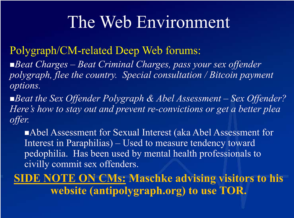Ниже представлен слайд одного из материалов ежегодного практического семинара АПА, 2019 год, Орландо Флорида, где представлен неисчерпывающий список Даркнет-ресурсов, где обучают методам «обмана полиграфа» (в первую очередь это касается преступлений в сфере половой неприкосновенности).